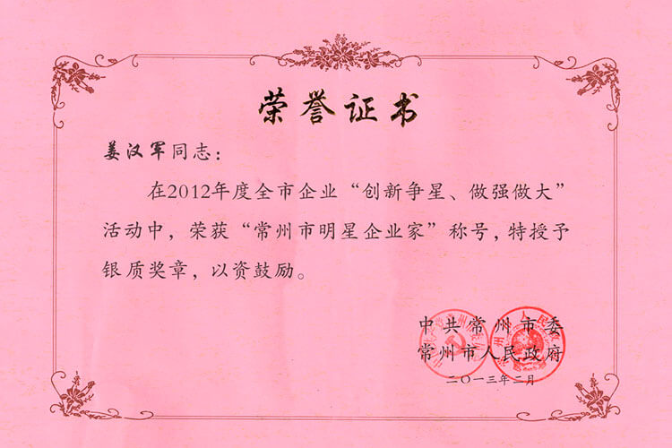 新年公司捷報(bào)頻傳。公司榮獲“工業(yè)四星企業(yè)”的榮譽(yù)稱號,公司董事長兼總經(jīng)理姜漢軍被常州市委、市政府授予“工業(yè)明星企業(yè)家”的榮譽(yù)稱號。